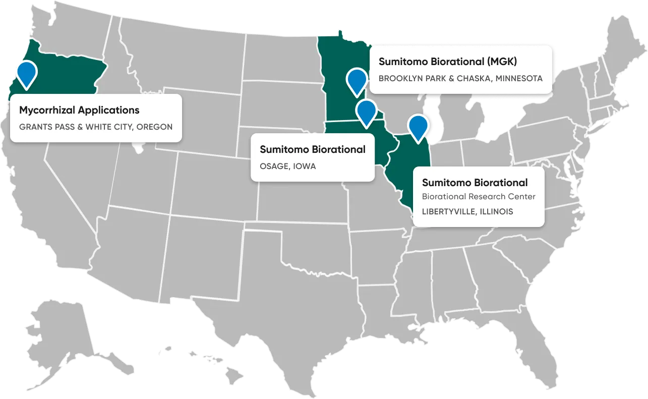 Our manufacturing facilities in Osage, Iowa; White City, Oregon; Brooklyn Park, Minnesota; and Chaska, Minnesota, bring these innovations to life by producing high-quality biorational solutions used around the world.