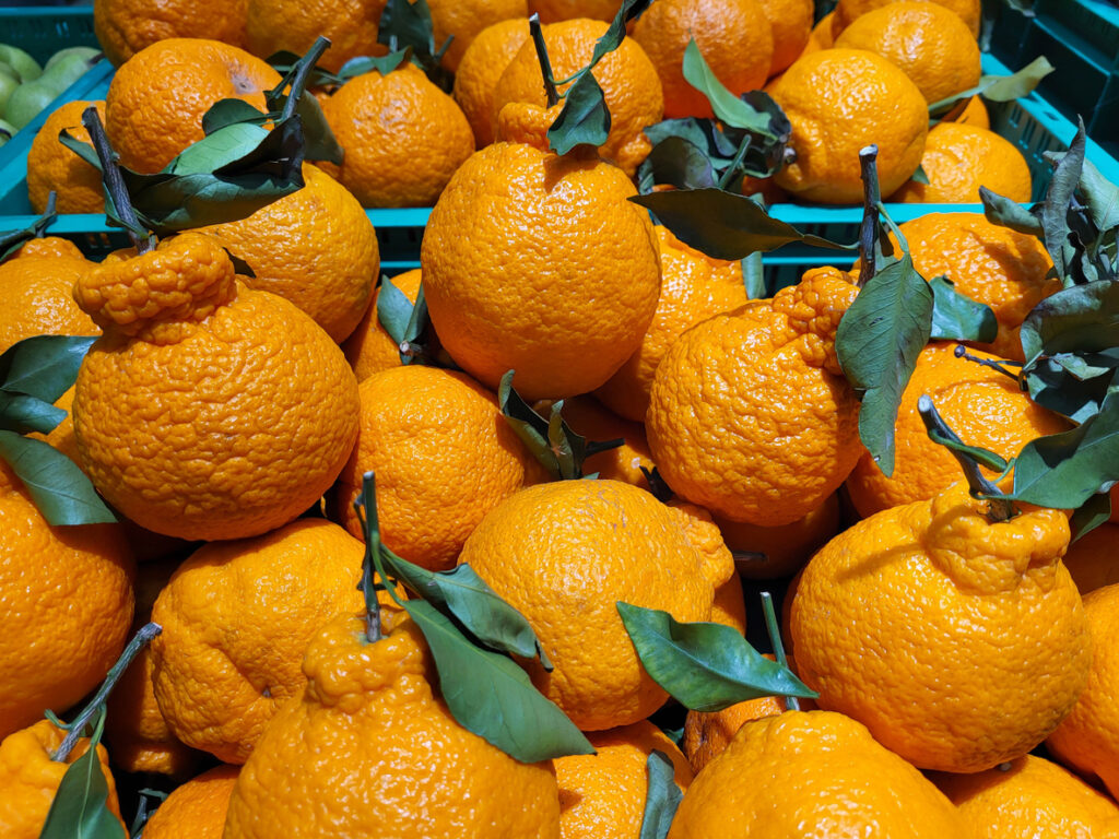 For pure sweetness, Sumo citrus (also known as Dekopon) is a winter favorite and easy to spot thanks to its distinctive topknot. These large, seedless mandarins are known for their high sugar content balanced with low acidity, making them almost dessert-like. They’re widely available at major grocery chains during their peak, though the season is relatively short.