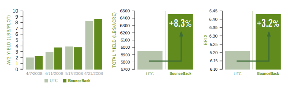 In a strawberry trial in Rocky Point, North Carolina, on Camarosa strawberries, applications of BounceBack increased total strawberry yield by 8.3% over the untreated control (UTC) across four pick dates. BounceBack also resulted in an average 3.2% increase in Brix compared to the UTC.
